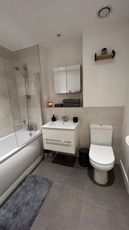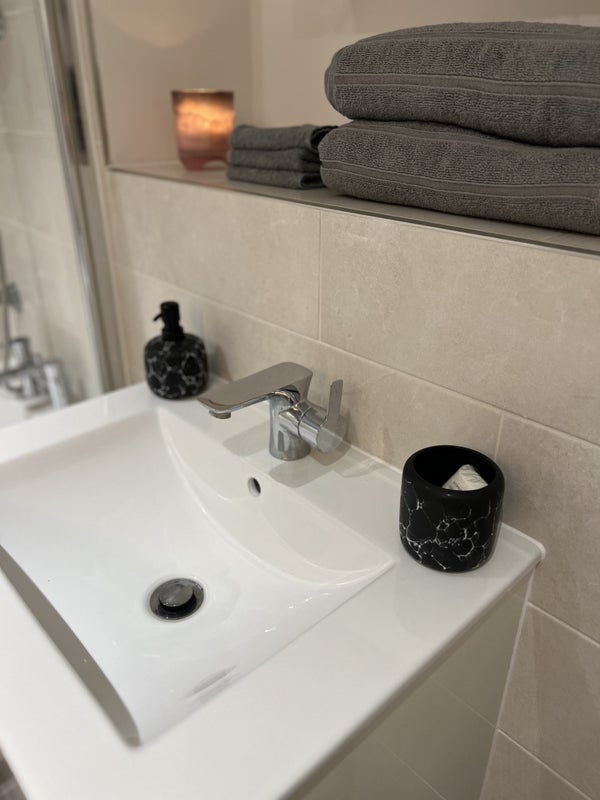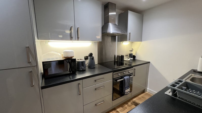 The apartment features a spacious lounge and kitchen area, complete with an HD Toshiba TV, an L-shaped sofa for ultimate comfort, and all necessary kitchen essentials. The bedroom boasts a cozy double bed with a luxurious Simba mattress, a double wardrobe for ample storage, and three large windows to let in plenty of natural light. The bathroom is equipped with a shower, bathtub, toilet, sink, and heated rail for added comfort.