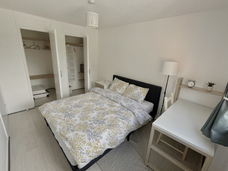 The spacious bedroom comes with a queen-sized bed, built-in wardrobe, desk, and chair for a cozy and functional living experience. The ground floor includes a hallway, kitchen, living room, and guest W.C., while the first floor offers two double rooms, one single room, and a shared bathroom. The house rules emphasize respect, cleanliness, and a smoke-free environment, ensuring a harmonious living environment for all residents.