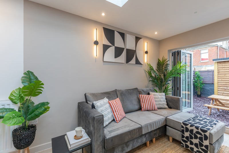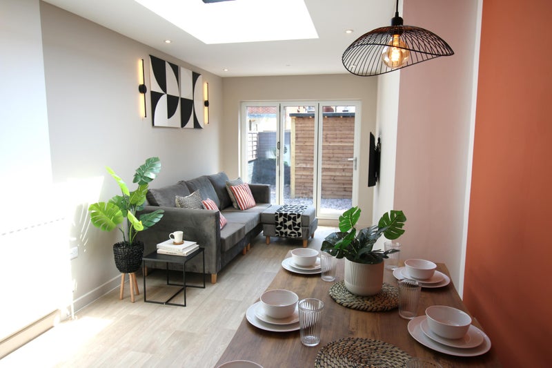 The available room features a cozy corner sofa with a footstool and a wall-mounted TV, creating the perfect space to relax after a long day. The communal kitchen is well-equipped with 2 ovens, an 8-ring induction hob, extractor fan, dishwasher, washing machine, washing machine/tumble dryer, fridge/freezers, microwave, and standard cutlery and cookware. Modern bifold doors lead to an enclosed patio area with a large bike store located at the rear, adding to the comfort and practicality of the living space.