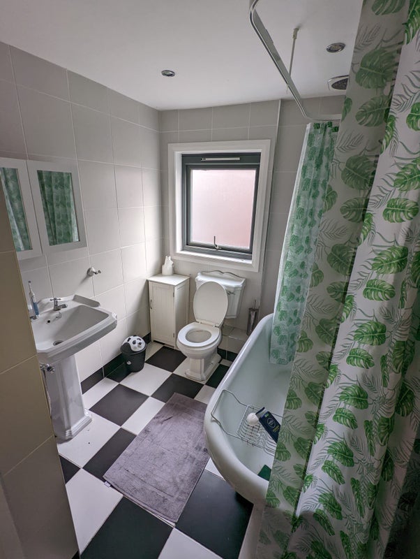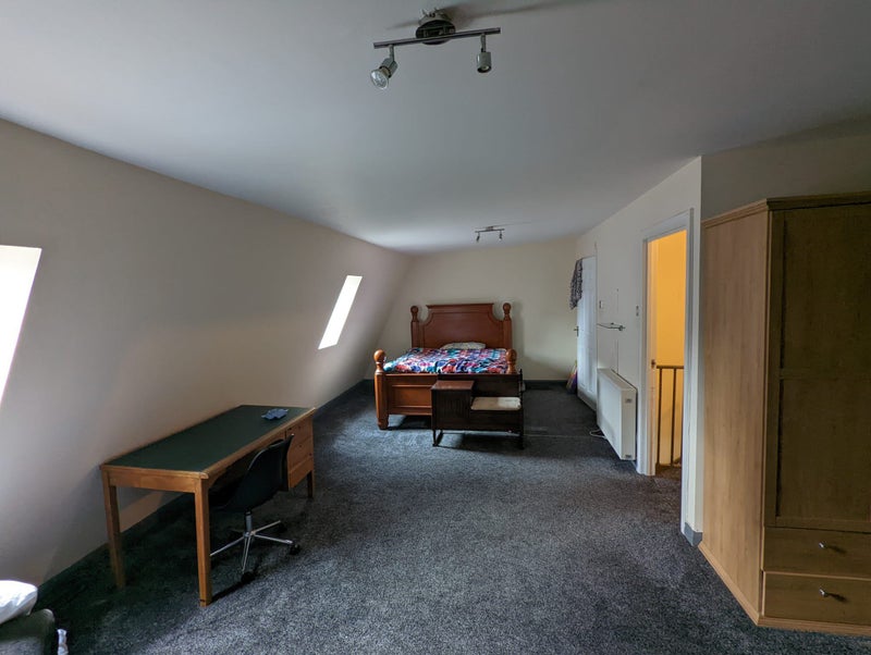 The apartment features two spacious bedrooms, one with an ensuite, and a main bathroom with a bath. The upstairs room is large and ideal for a couple, while the third room can be used as an office or study. The living area has a modern feel with high ceilings and large windows, creating a bright and airy atmosphere. The furnishings are stylish and comfortable, making this flat a cozy and practical living space for residents.