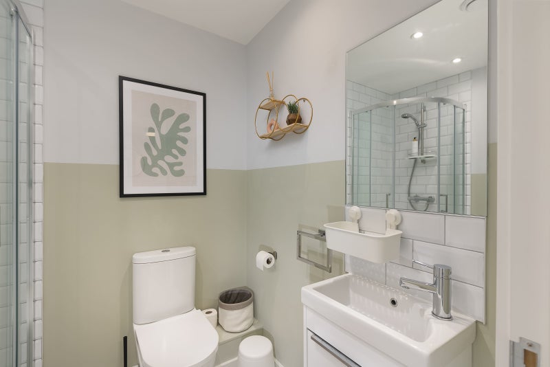 The available one-bedroom apartments are tastefully furnished with modern fixtures and decorations, creating a comfortable and inviting atmosphere. The living space includes a cozy sofa, contemporary bathrooms, and a large TV for entertainment. Shared spaces within the apartment are well-maintained and designed for practicality and comfort. Residents can enjoy the convenience of a fully furnished and equipped living space that feels like home from the moment they step in the door.