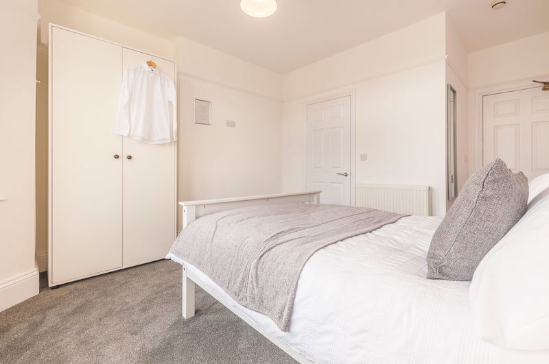 Room 5 is a spacious and well-appointed room on the first floor, featuring a large window that fills the space with natural light. The room is tastefully furnished with modern decor and comfortable amenities, including a high-spec ensuite bathroom with a large shower. The shared areas of the house are professionally cleaned fortnightly, ensuring a tidy and welcoming atmosphere for all residents. With allocated storage space and a fully networked system for internet access, this living space is designed for convenience and functionality.