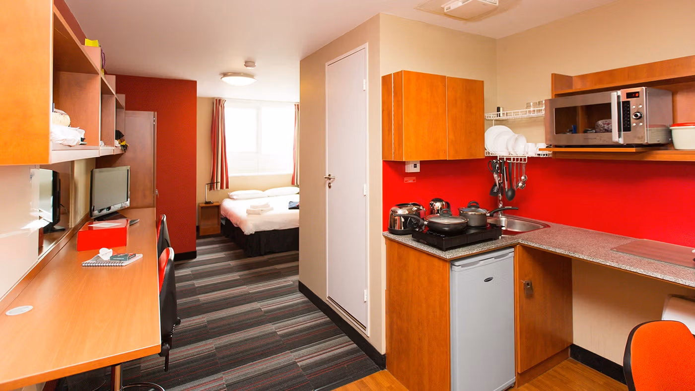 Students can find single and double studio apartments at the Collegiate Burges House accommodation. These room types are curated to offer an independent living unit for students with a range of amenities. Featuring a single bed, study desk and chair, storage space, flat screen TV and a fully-equipped kitchenette, it offers maximum comfort to residents.