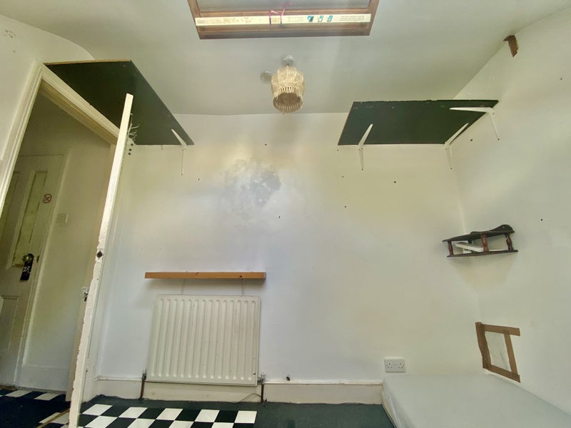The single room features an open wardrobe, a personal fridge in the kitchen, a bed with two mattresses, a built-in desk with a chair, and plenty of shelves for storage. Additionally, there is a large loft storage area and a skylight window with a blind. The shared areas include a bathroom/shower, kitchen, and an outside patio. The double room is furnished with a personal bar fridge, an open wardrobe, a double sleeper couch bed with storage drawers, a chest of drawers, built-in shelves, two desks with chairs, and offers beautiful views of Brighton and the ocean.
