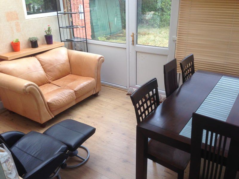 The house features a welcoming entrance porch leading to a reception hallway with a cozy sitting area. The lounge room is tastefully furnished with a fireplace, corner sofa, dining table, library, chest of drawers, and a Samsung Smart TV. Additionally, a conservatory room provides a relaxing space with a leather sofa, reclining chair, and dining table. The large fitted kitchen is fully equipped with branded appliances, including a fridge, washing machine/dryer, dishwasher, and various kitchen gadgets for convenience. Upstairs, three bedrooms and a bathroom offer comfortable living spaces for residents.
