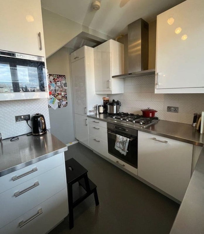 The available room is cozy and practical, with a large built-in desk, small rail, and a spacious cupboard for storage. The flat offers a comfortable living space with a dining area in the living room and a welcoming atmosphere. Shared spaces are well-maintained, and the flatmates are easy-going professionals who value a clean and harmonious living environment. The property also includes a bike shed for storage needs.