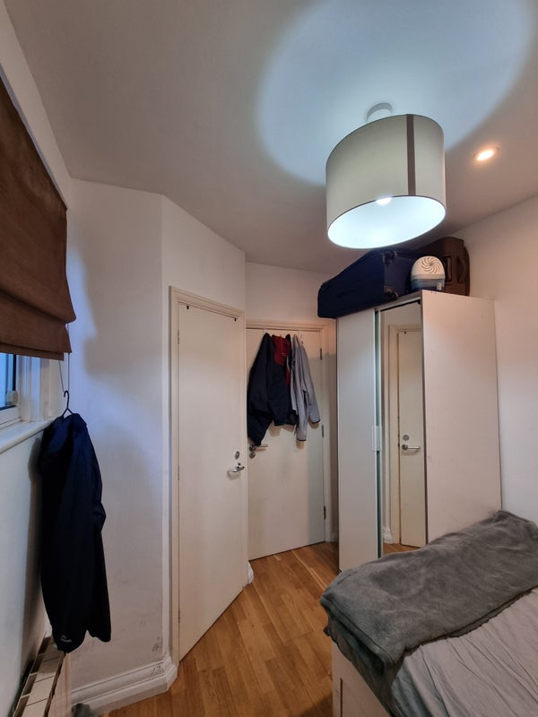 The available bedroom is furnished with essential amenities for comfort and convenience, including a wardrobe, double storage bed, and mattress. The main bathroom is shared, but residents have their own private toilet and sink with vanity shelves and a window. The atmosphere of the flat is welcoming and conducive to social interactions, with shared spaces like the kitchen diner and living area designed for practicality and comfort. The overall feel of the space is cozy and inviting, perfect for a working professional looking for a peaceful living environment.