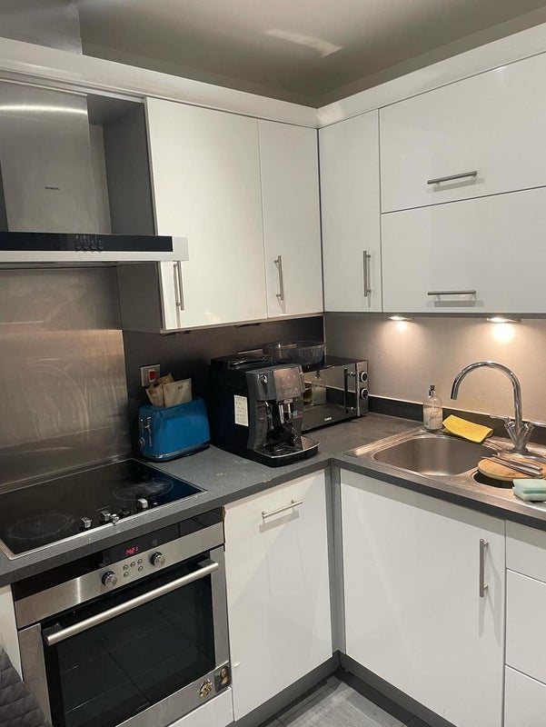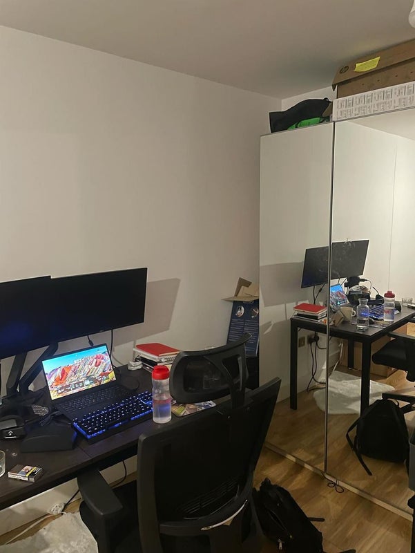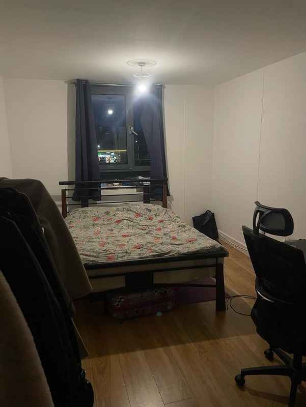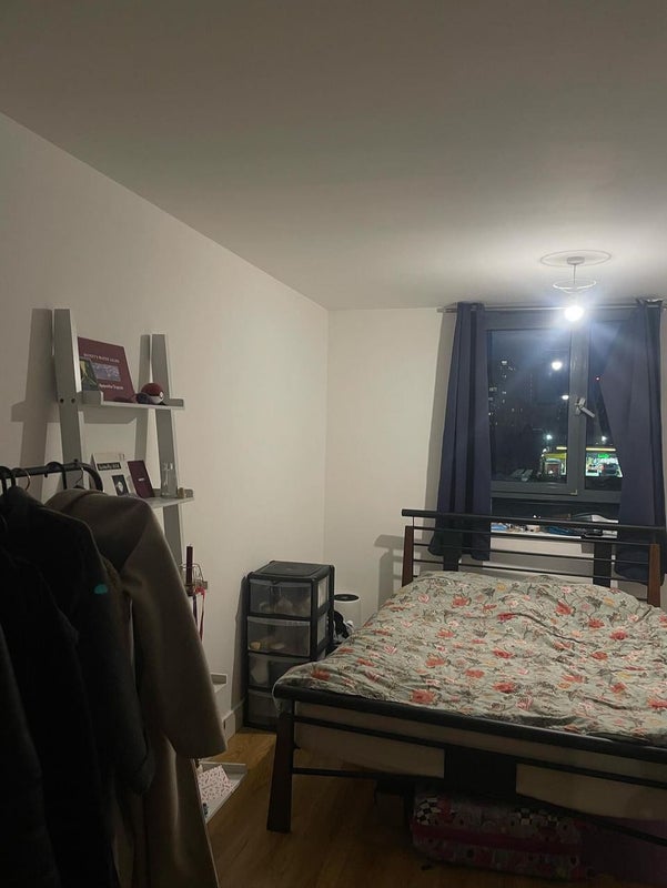 The available room in this flat is tastefully furnished with a comfortable king-size bed and a spacious wardrobe with mirrored doors. The overall ambiance of the flat is cozy and inviting, with freshly painted walls and new furniture in the living room, including a sofa, glass table, and coffee table. The shared spaces are designed for comfort and practicality, creating a welcoming atmosphere for residents to relax and socialize. The terrace offers a picturesque view of Central London, perfect for unwinding after a long day.