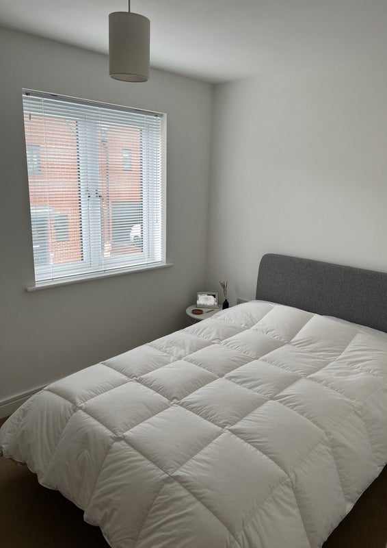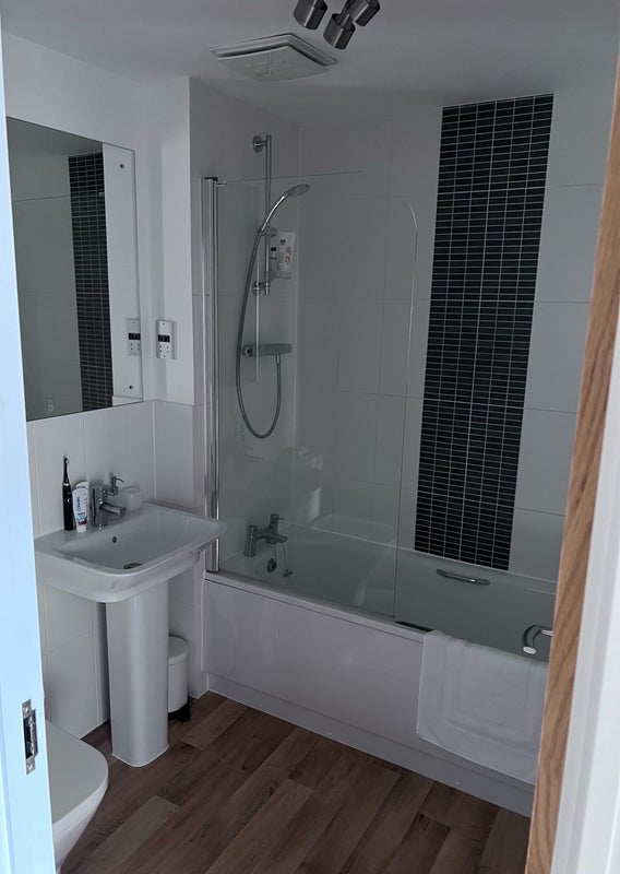 The room in this house offers a cozy and comfortable living space, with a built-in closet and a brand new Emma mattress on the double bed. The shared bathroom is equipped with modern amenities, including an over-the-bath shower, central heating, and a stylish sink with a mirror. The open plan kitchen-dining-living area is spacious and well-equipped with essential appliances, leading out to a sunny back garden. The atmosphere in the flat is peaceful and conducive to relaxation, perfect for unwinding after a busy day.