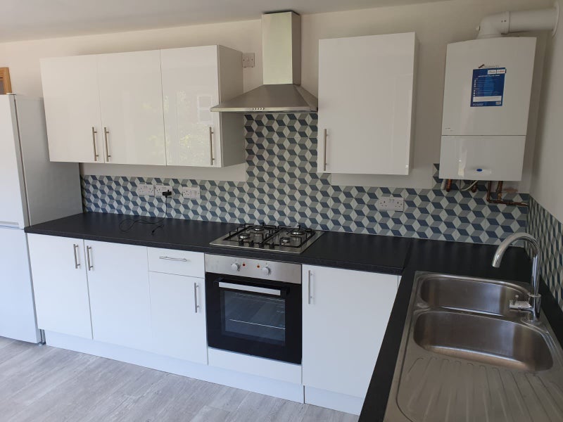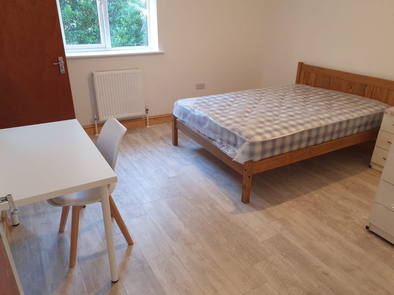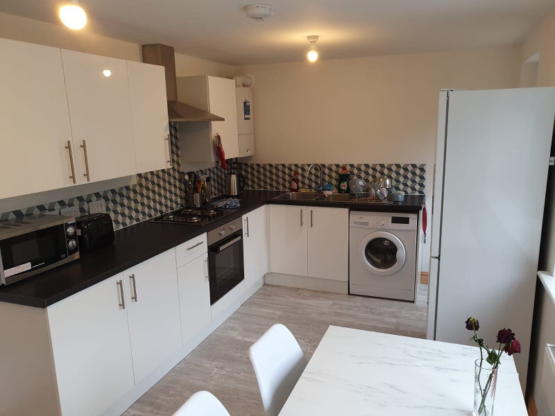 The double bedroom comes fully furnished with an en-suite bathroom, wardrobe, bedside drawer, bed, chair, and desk, ensuring a comfortable living space for the resident. The modern kitchen is equipped with white goods, a microwave, oven, and a dining area with a dining table for shared meals. The communal areas are professionally cleaned, and the overall atmosphere of the flat is welcoming and conducive to a harmonious living environment.