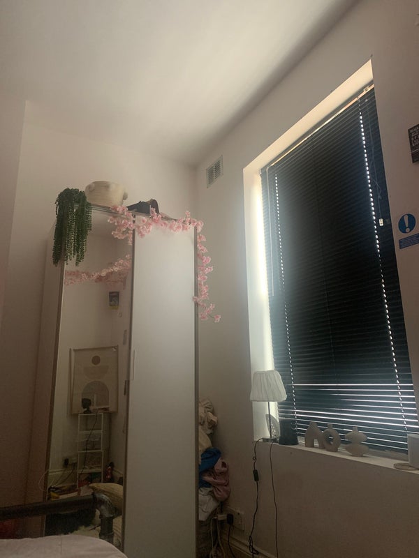 The available room is well-appointed with a large wardrobe, desk, chair, and a double bed. The room also includes a fireplace (not for use) and a full-length mirror. The kitchen is spacious and equipped with modern appliances, including a 6-hob cooker, 2 fridges, and a double sink. Access to the garden from the kitchen adds a touch of outdoor space with a picnic table for relaxation. The living room offers a comfortable setting for socializing and entertainment.
