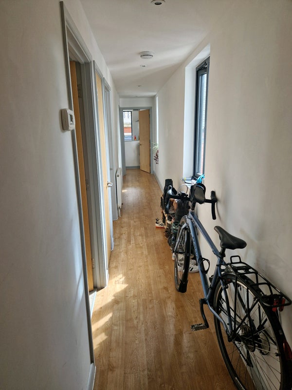 The available room is spacious, easily accommodating a double bed, chest of drawers, and desk/chair. It features a large built-in wardrobe for ample storage. Each resident has their own bathroom, with the owner enjoying an en suite. The flat also boasts a sunny terrace, perfect for relaxing or entertaining. Shared spaces include a long hallway for bike storage and a parking space for residents to share.