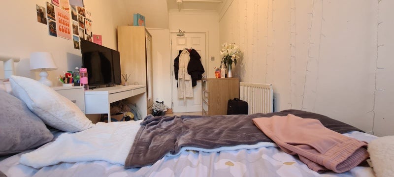 The available room is tastefully furnished with essential amenities for comfort and convenience. The cozy double bed, chest of drawers, wardrobe, and desk provide ample storage and workspace. The shared spaces in the flat, including the large kitchen and two bathrooms, are well-maintained and offer a welcoming atmosphere for residents. The overall feel of the space is homely and practical, ensuring a comfortable living experience for all flatmates.