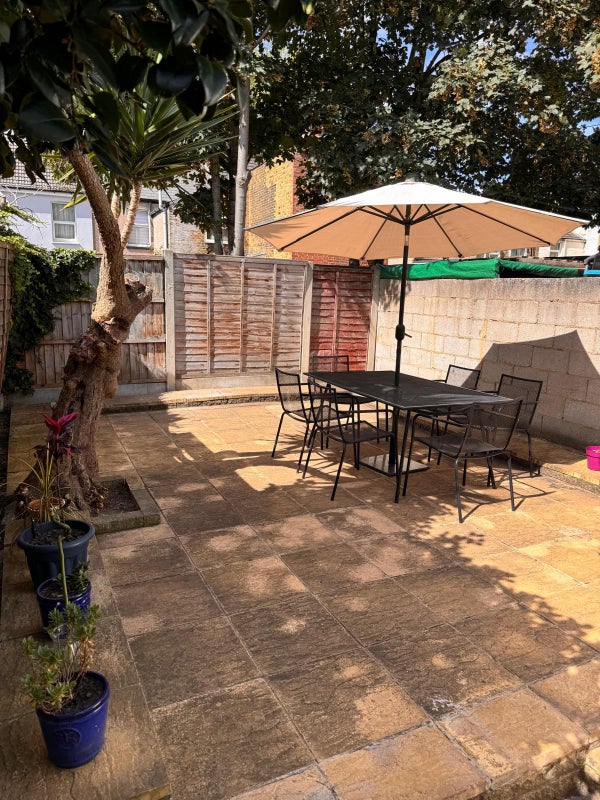 The available room is fully furnished with a comfortable double bed, bedside tables, a spacious desk, an office chair, and a large fitted triple wardrobe. The shared living spaces include a dining area, separate kitchen, and a cozy living room for relaxation. The atmosphere in the flat is friendly and welcoming, with a focus on cleanliness, respect, and plenty of laughs among the flatmates. The rear patio with a garden set provides a peaceful outdoor space for relaxation.