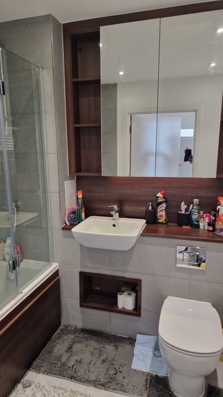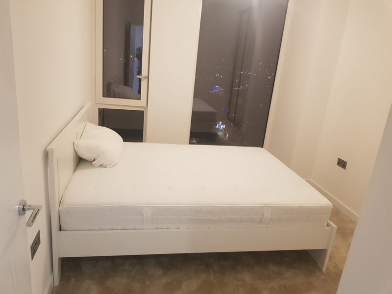 The double bedroom in this brand new apartment features an inbuilt wardrobe, large vanity mirror wardrobe door, side table, separate desk (not shown in current photo), work chair, standing crystal tail lamp, and wall-mounted fan with a remote. The carpeted and marble-tiled floor adds a touch of luxury to the space. Residents can enjoy a kitchen with an oven, microwave, electric stove, and fridge/freezer, as well as a small dining area. All bills, including wifi, council tax, utilities, and service charge for the building/concierge service, are included.