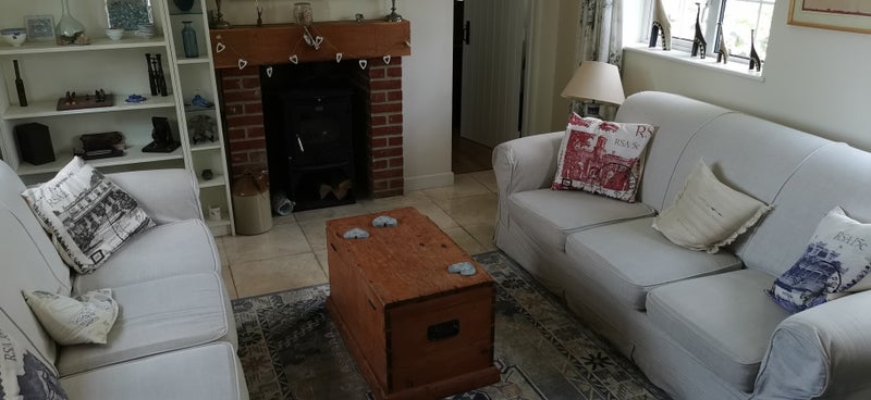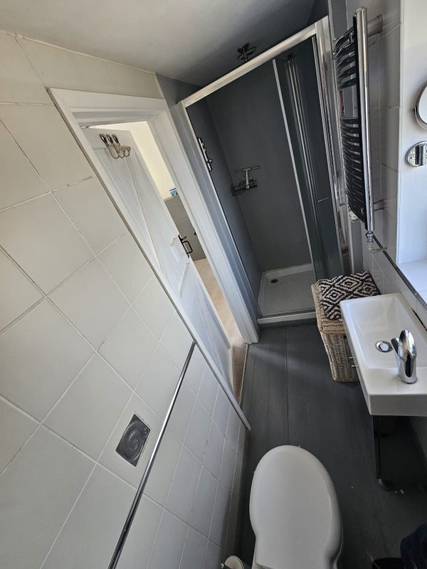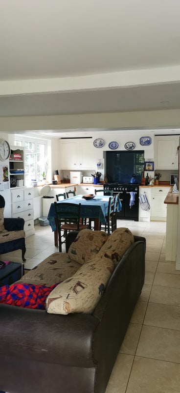 The available property is a large double bedroom with an ensuite bathroom in a 4-bed house share located in a stunning detached Kentish farmhouse in Otham. The room features built-in wardrobes and overlooks the property's beautiful back garden. The house share consists of 4 other individuals, including a couple and a live-in landlord, all aged between 23-31. The property offers various amenities such as a large garden with a patio, 2 family bathrooms, a formal living room, a dining room, an open-plan kitchen and communal area, a small study, an attic for storage, and a garage. Private parking is also available on-site. The rent is £750pcm, inclusive of council tax, water bills, and gas, with electricity and heating oil costs to be discussed with the landlord.