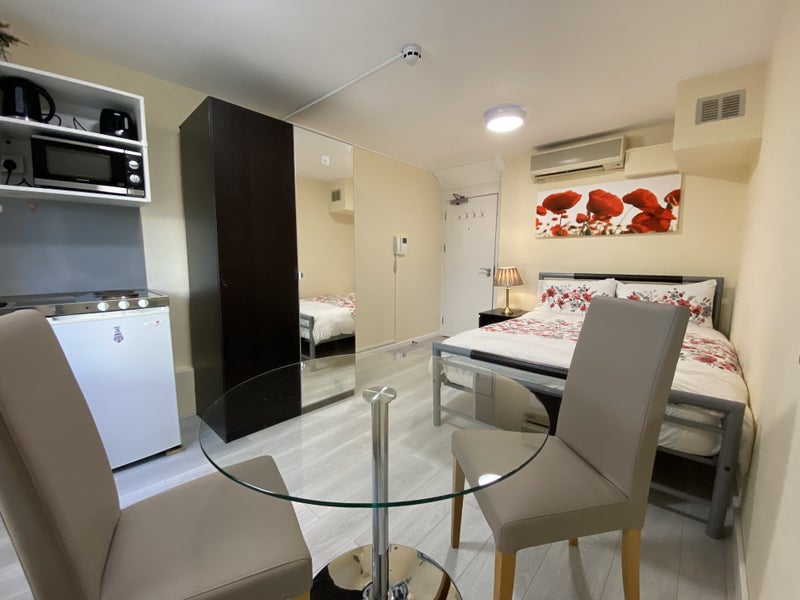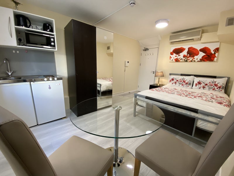 This fully furnished double studio flat is ideal for short-term holiday, summer course, or internship renters. The 12.6 sq. meter space features an air conditioner unit, smart TV, fully equipped open plan kitchenette with a cooker, fridge, and microwave, and a private bathroom outside with a shower and toilet. The flat also boasts wooden flooring, double glazed windows, communal laundry room with a washing machine and dryer, lift access to the first floor, and 24-hour CCTV security. Located just a 3-minute walk to Gloucester Road station and 8 minutes to South Kensington station, the flat offers great local amenities such as Sainsbury's, Waitrose, Boots, restaurants, and shops, with Hyde Park just a 15-minute walk away. Ideal for students from Imperial College, RCA, RCM, UAL, and other universities in the area.