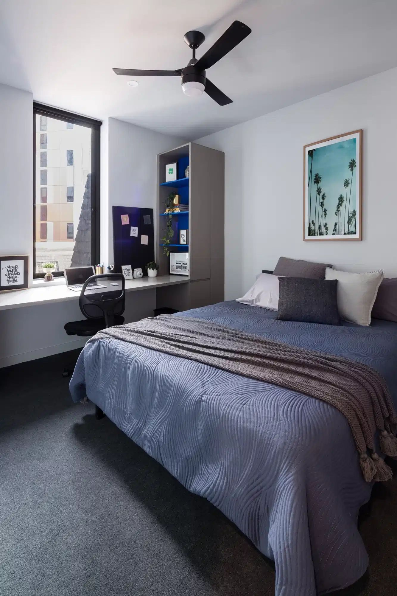 Studio - Depending on sizes and views, studio rooms are private, self-contained areas, boasting exclusive facilities for those who are seeking a complete independent and private student accommodation in Australia within a price range from AUD 350 per week to AUD 480 per week. Room amenities at the Dwell Village include a kitchenette, compact bed, ample storage, a study desk and chair, and a private bathroom.