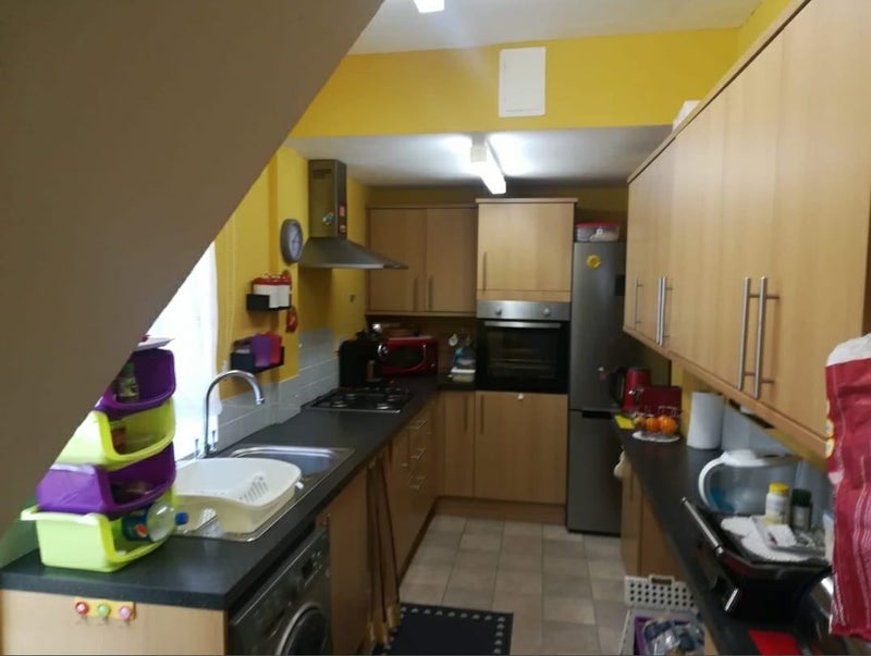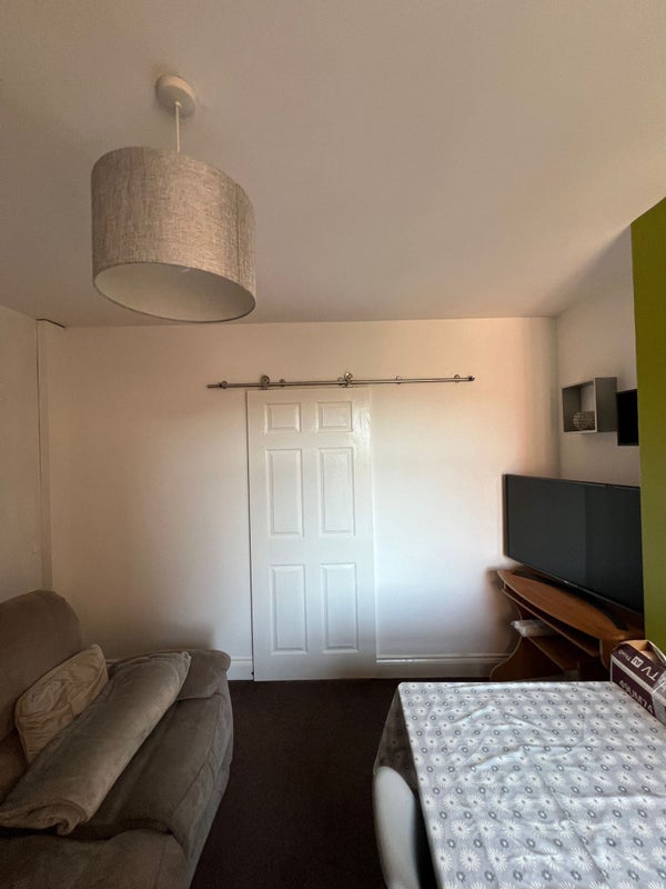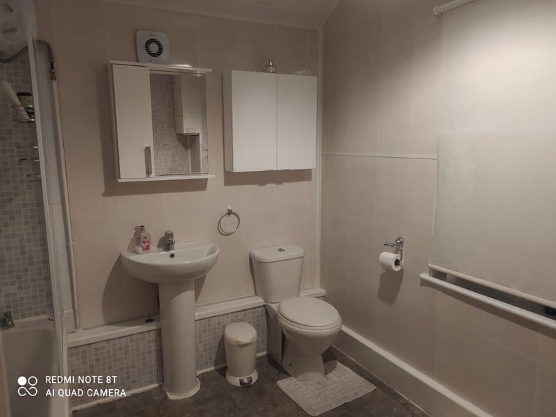 The house offers two spacious rooms, each furnished with a double bed king size, large double chest of drawers, wardrobe rails, workspace or desk with a comfortable chair, bedside table, and luxury curtains. The shared bathroom is complete with a bath and shower, along with ample storage space. The fully furnished kitchen includes an oven, electric hob, washing machine, kettle, microwave, and toaster. The communal area features a comfortable sofa, eating area, and a smart TV, creating a welcoming atmosphere for residents to relax and socialize.