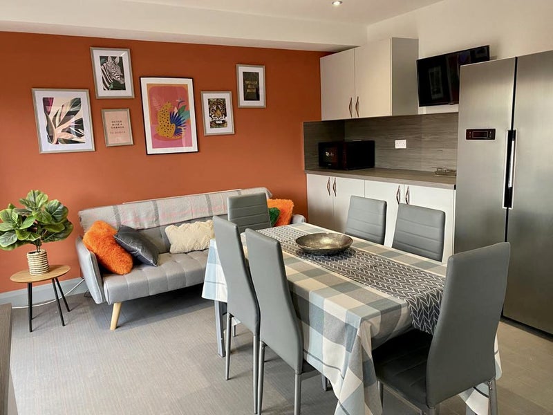 The property features a spacious and bright kitchen/dining/living space on the ground floor, with modern amenities such as a 4-ring cooker, American style fridge/freezers, dishwasher, and washing machine/dryer. The shared space includes a comfortable 3-seater sofa, dining table/chairs, and all necessary cookery pots, pans, utensils, and cutlery. Each of the 6 double bedrooms is nicely proportioned, furnished with a double bed, wardrobe, desk, and chair. The available loft bedroom (ROOM 5) offers a cozy retreat with a large walk-in shower in the adjacent bathroom.