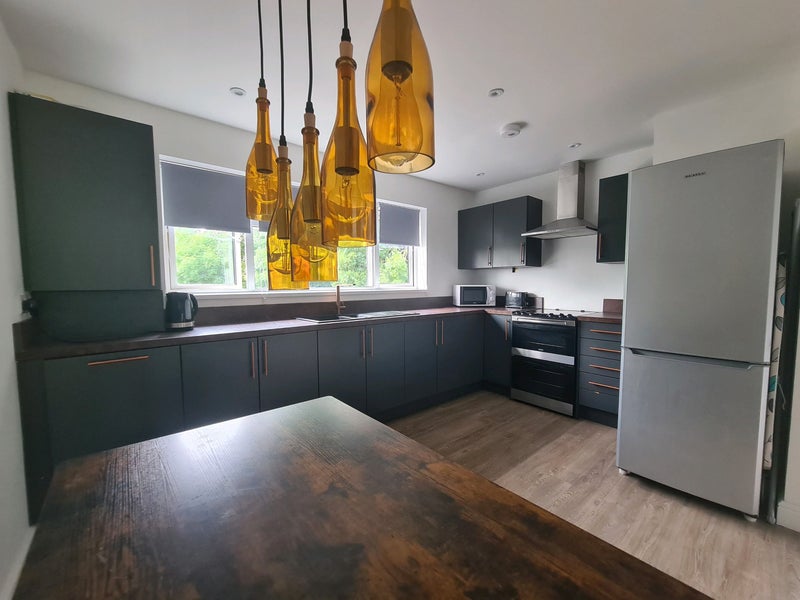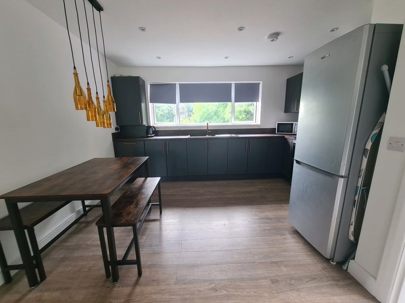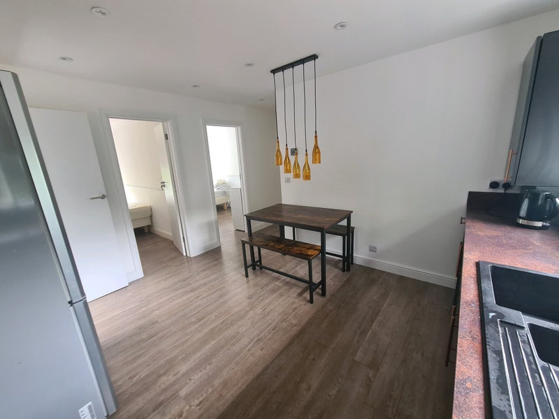 This recently renovated 1st floor flat boasts its own external front door and parking space for up to 4 vehicles. The property has been completely modernized to a high-end finish, featuring wooden flooring throughout and a tiled bathroom with underfloor heating. A brand new, top-of-the-line kitchen is set to be fitted, complete with high-end appliances such as a large Bosch fridge-freezer unit, an induction oven & hob, and a new washing machine/dryer. The bathroom includes a brand new vanity unit with a matching lit mirror cabinet and a spacious walk-in shower with instant hot water. Additionally, the property has received additional roof insulation, making it highly energy efficient.