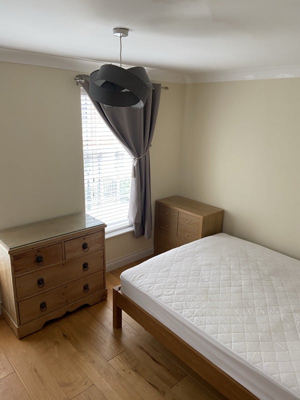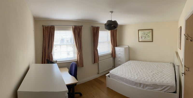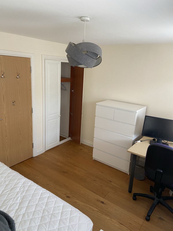 The available rooms are furnished with comfort and practicality in mind. Bedroom 1 includes a King divan bed, wardrobe, desk, and other essentials, while Bedroom 2 features similar amenities. Shared spaces include a spacious living room with entertainment options, a modern kitchen with personal storage space, and a family bathroom shared between two residents. The house is spread over three floors, offering a comfortable and functional living environment.