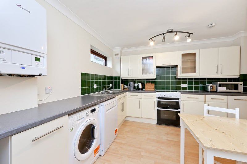 The available room, Bedroom 3, offers a cozy and inviting atmosphere with its king-sized bed and essential furnishings. Tenants share a bathroom with one other resident, while the third tenant has their own en-suite bathroom. The flat boasts a comfortable living area with wooden floors and plenty of natural light. The kitchen is generously sized, providing a functional space for cooking and dining.