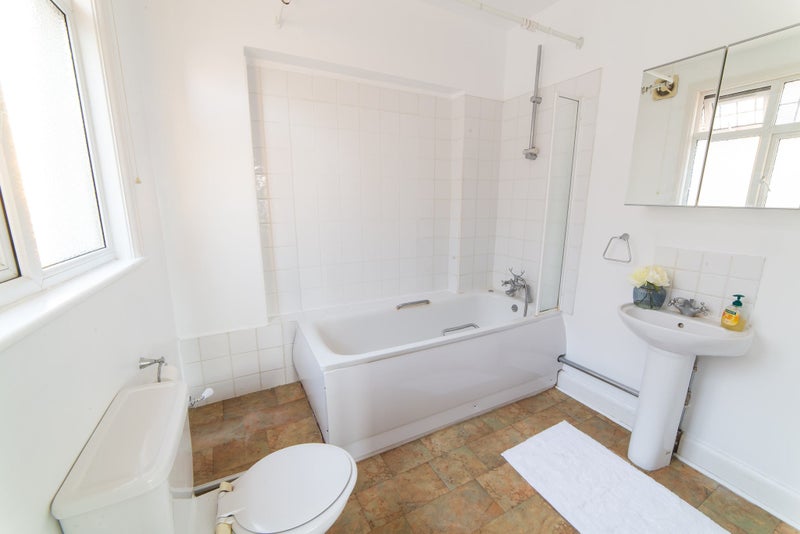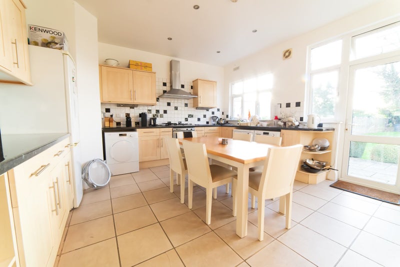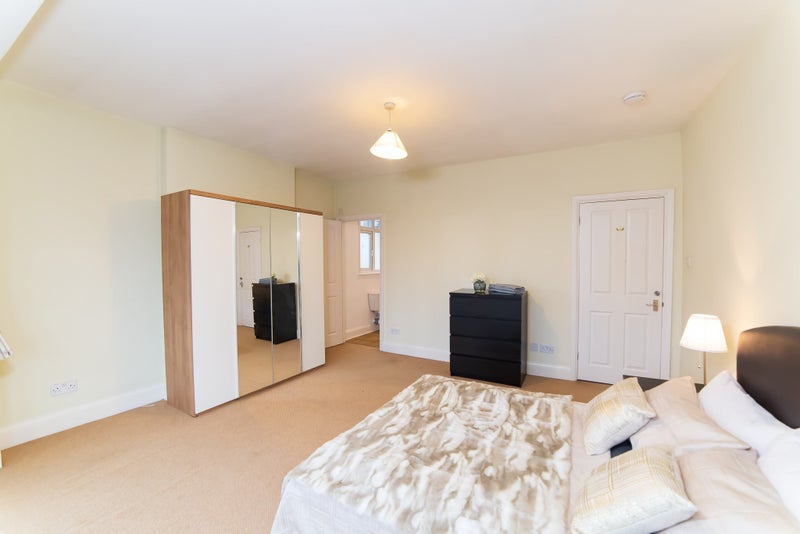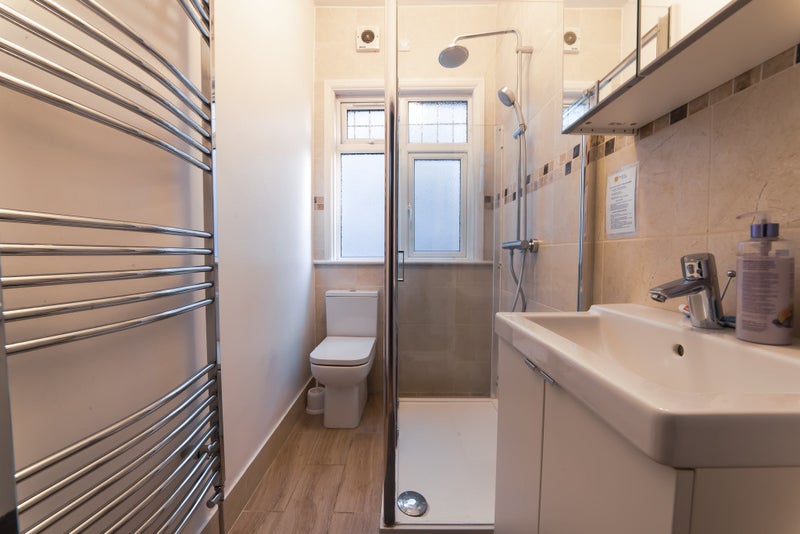 Room 2 is a furnished double room on the first floor with a double ottoman bed, bedside tables, a chest of drawers, a wardrobe, and a desk. The room also includes a private bathroom for added convenience. The house boasts comfortable shared spaces, including a kitchen diner with access to a well-maintained garden and a lounge perfect for movie nights.