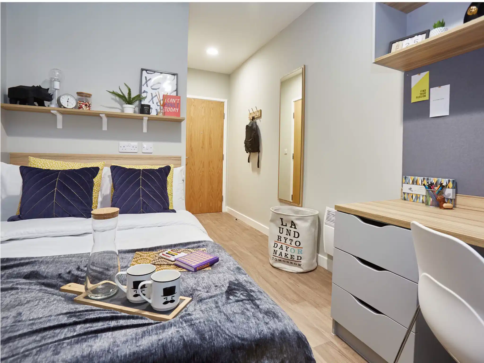2. Studios -These provide you with a range of amenities including a chair & desk, large double bed, under-bed storage, wardrobe, en-suite shower, en-suite sink, en-suite toilet, en-suite towel rail, heating, smoke alarm, large window, microwave, combi oven, kitchen storage, and fridge freezer. Rooms can be found, such as: