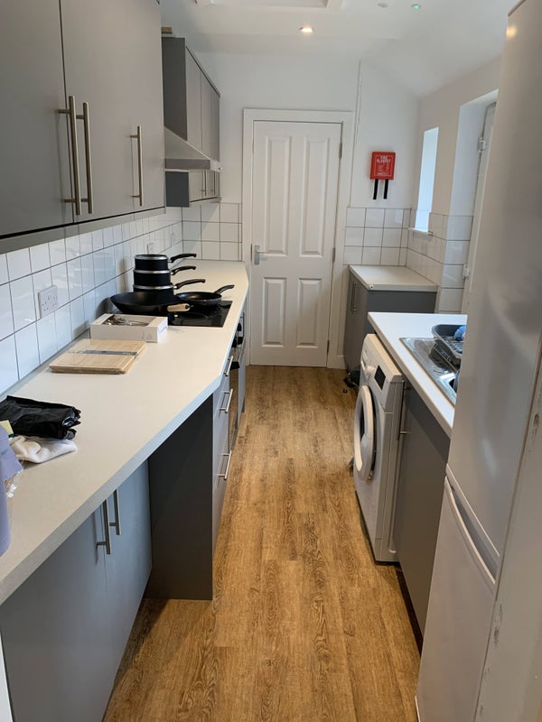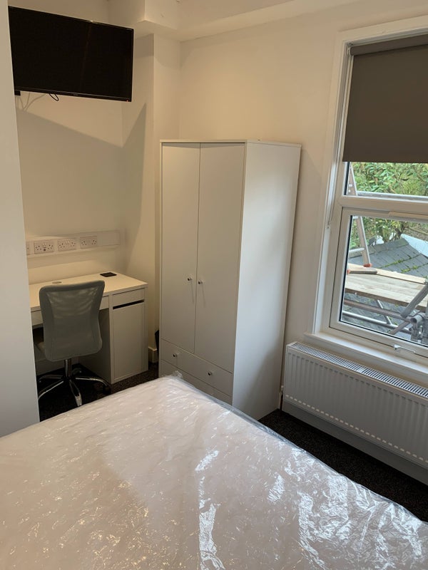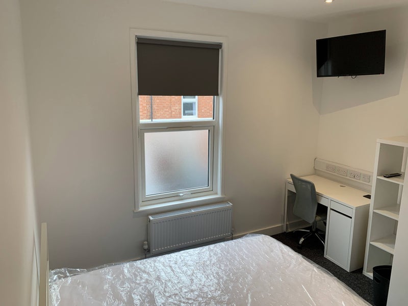 Each bedroom in this house features an ensuite shower/bathroom, a smart TV, a solid steel framed bed with a memory foam mattress, a desk with internet sockets and USB chargers, blackout roller blinds, a wardrobe with drawers, and a storage shelving unit. The shared spaces include a fully stocked kitchen with new cooking facilities, dimmable LED lighting, and blackout roller blinds in every room for privacy. The house is fully double glazed with secure locks on all doors and windows, ensuring safety and security for residents.