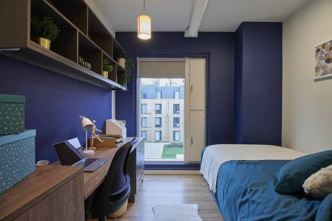 The room is tastefully furnished and designed for comfort and convenience. The small double bed provides a cozy sleeping area, while the en-suite shower room offers privacy and convenience. The study space with desk and chair is ideal for academic pursuits or remote work. The communal kitchen and shared spaces create a welcoming atmosphere for socializing and relaxation. Overall, the living space is practical, comfortable, and well-equipped for residents' needs.