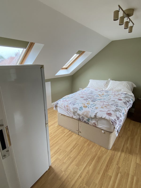 The furnished room includes a double bed, wardrobe, chest of drawers, fridge, table, chairs, and ample storage space. The bathroom features storage shelves and a cupboard, while the shared kitchen is fully equipped with essential appliances and utensils. Residents have the opportunity to enjoy the kitchen in the evenings as the current flatmates primarily use it during the day. While there is no shared living room or garden, residents have the freedom to pursue their own social activities or occasionally engage in group outings such as walks, coffee outings, tennis, yoga, or drinks.