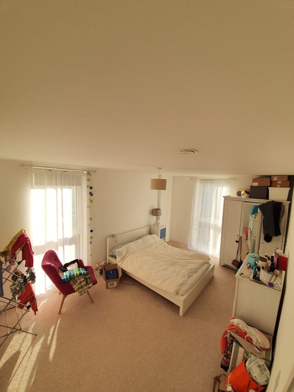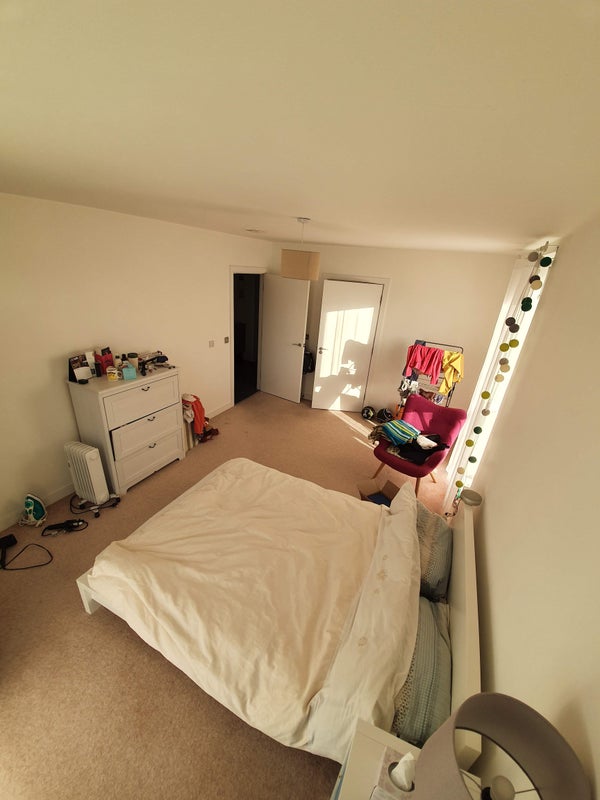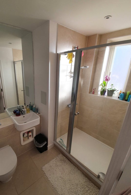 The available room is a spacious double with large ceiling-to-floor windows and an ensuite bathroom with a pleasant window for natural light. The overall atmosphere of the flat is cozy and tidy, perfect for residents to feel at home. Shared spaces are well-maintained, and the resident managers are on-site to assist with any needs promptly. Comfort and practicality are prioritized in the furnishings and layout of the apartment, ensuring a pleasant living experience for all flatmates.