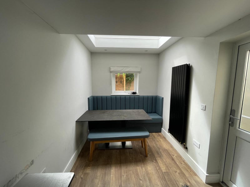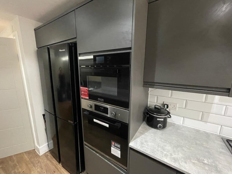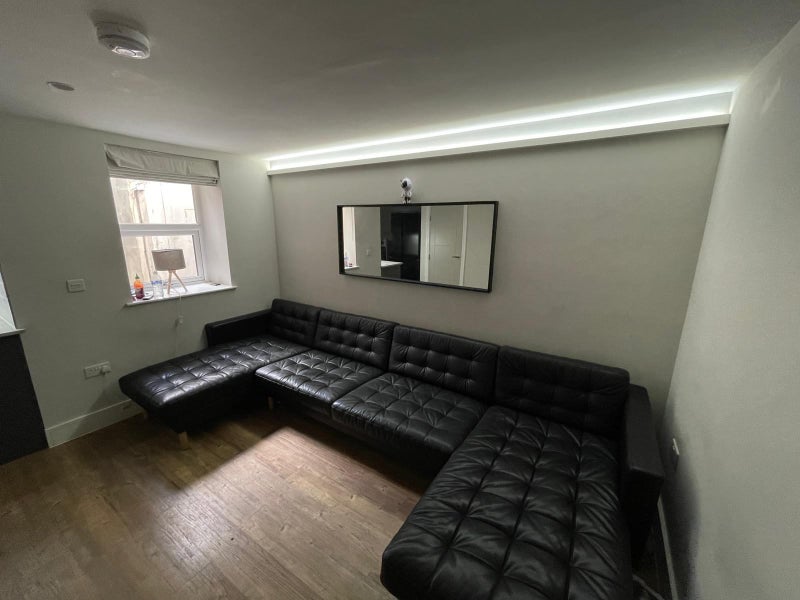 The available room in this student house offers a cozy and functional living space, perfect for studying and relaxing. The furnishings, including the large wardrobe, desk, and chair, provide ample storage and workspace for the resident. The shared living/kitchen/dining room is spacious and inviting, creating a welcoming atmosphere for socializing with flatmates. The overall feel of the flat is modern and well-maintained, ensuring a comfortable living experience for the residents.