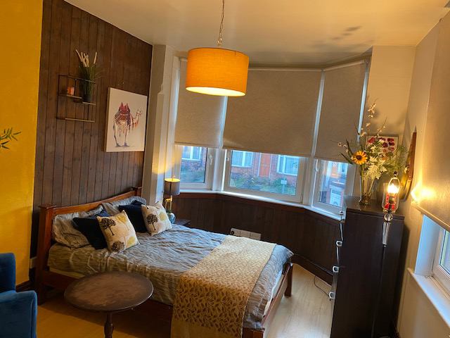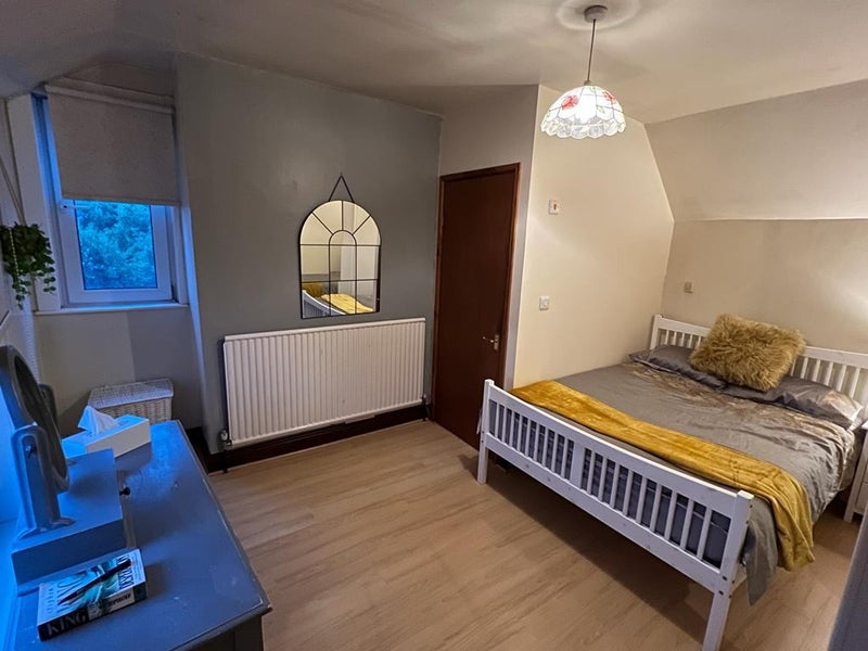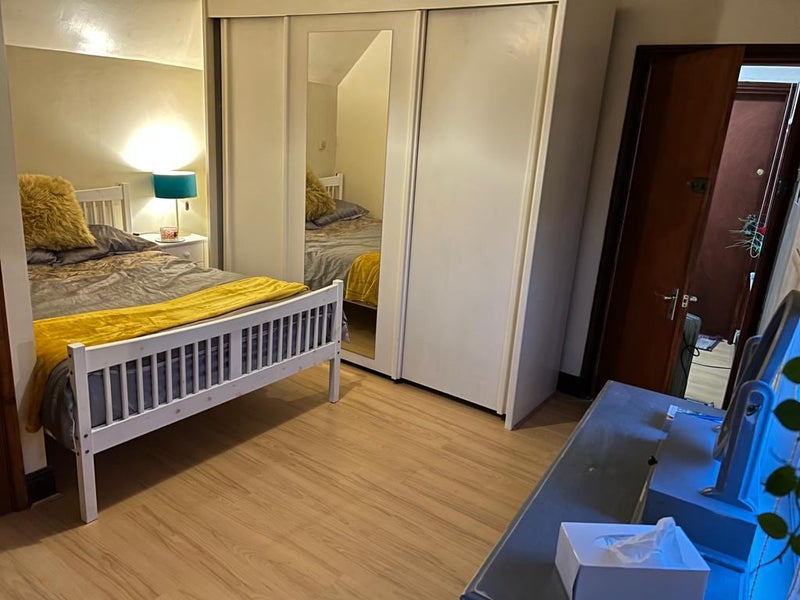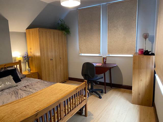 The bedroom is well-furnished with modern, warm decor, including a double bed with mattress, wardrobe, bedside unit, desk and chair, wall and full-length mirror, bedside lamp, and blackout blinds. The overall atmosphere of the flat is cozy and homely, providing comfort and practicality for residents. Shared spaces like the communal kitchen and living area are designed for convenience and relaxation, making it a welcoming environment for all.