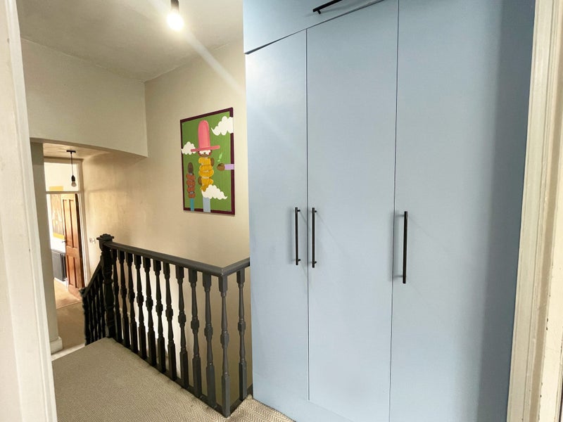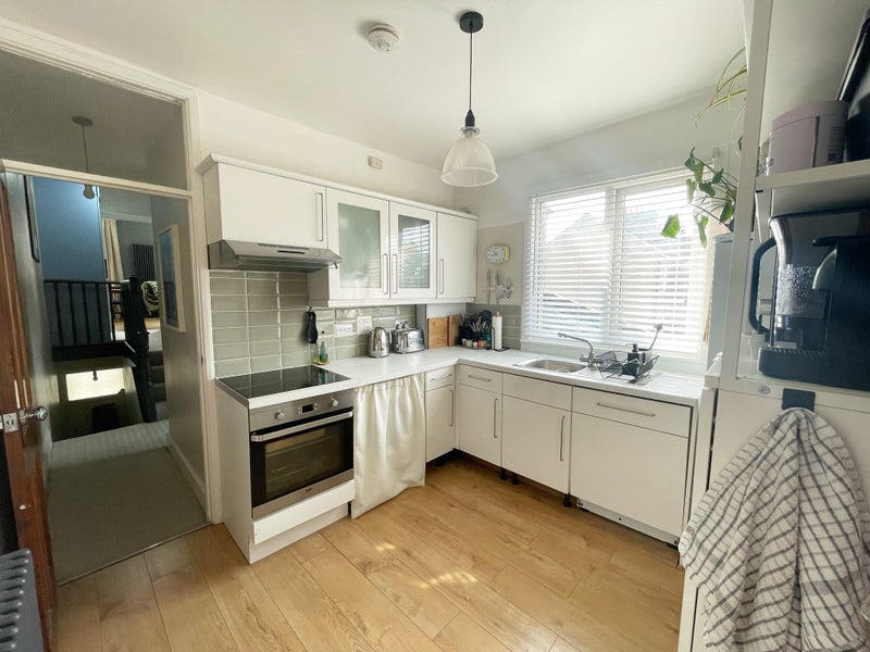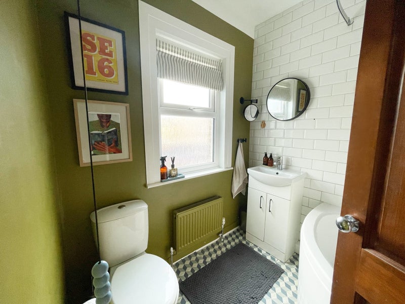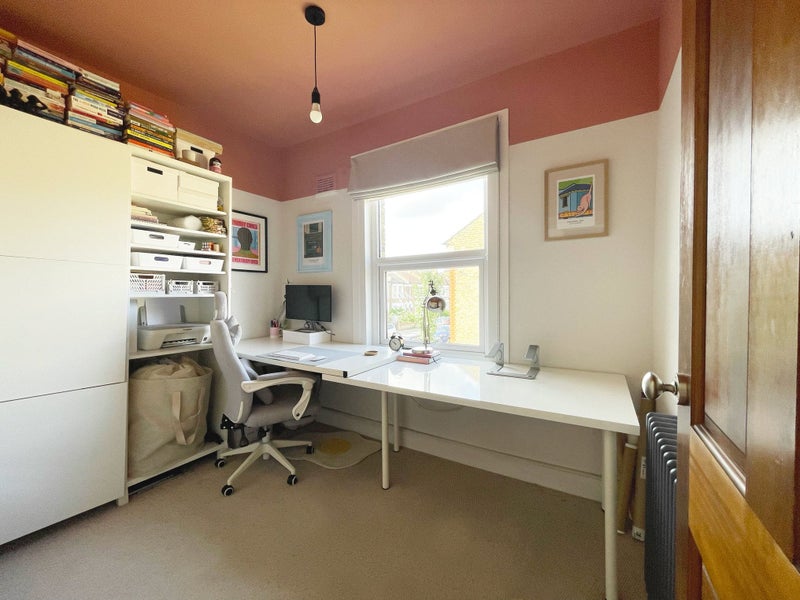 The generous living room features original Victorian fireplace and ample natural light from a beautiful bay window, creating a perfect space for relaxation and entertaining guests. Room 1 offers a double bedroom with a large floor-to-ceiling built-in wardrobe for ample storage, while Room 2 is currently used as a home office. The fully equipped kitchen boasts modern appliances, including a dishwasher and induction hob, along with plenty of storage space. The sleek bathroom design includes a jacuzzi-sized bathtub and shower for added luxury.