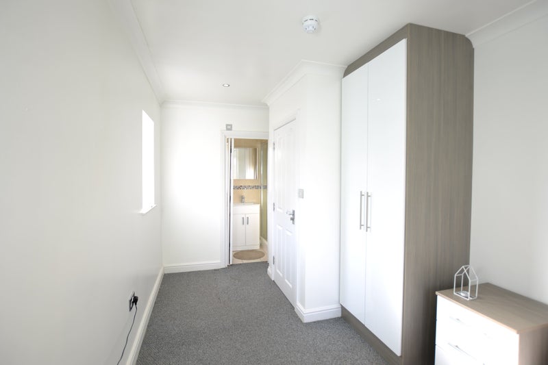 Room 5, situated on the first floor, is furnished with a double bed, bedside table, built-in wardrobe, and space for additional furniture. The ensuite includes a sink, toilet, and shower for added privacy and convenience. The house offers a comfortable atmosphere with shared spaces designed for practicality and comfort. The internet connectivity is reliable, with the option for wired broadband in the room if needed.