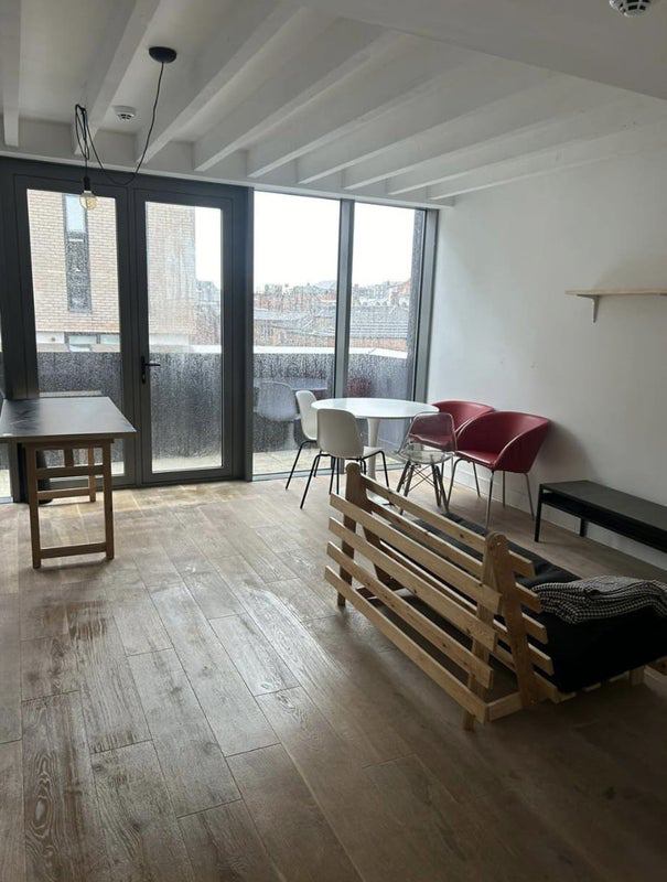 This apartment has 2 rooms available for rent in a shared flat with a 25-year-old female flatmate named Season and her cat Lucky. The available rooms are larger double rooms, one with an en-suite bathroom. Both rooms come furnished with open plan wardrobes, bedside drawers, electric blinds, and double beds. The flat has a modern feel with a newly renovated interior, featuring a large balcony and a private rooftop. The spacious kitchen area has floor-to-ceiling windows that brighten the living space, leading to a room-length balcony. There is a shared large bathroom with a bath/shower between the two rooms, as well as a small bathroom downstairs. The flat is looking for friendly and clean individuals to fill these rooms as soon as possible.