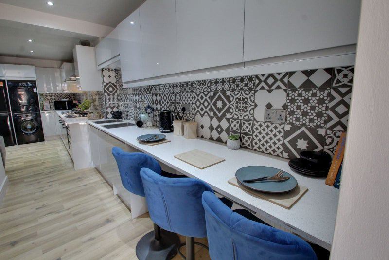 The living room is a luxurious space equipped with a large smart TV, high-speed Fibre broadband, and a comfortable seating area for dining and relaxation. The kitchen features essential appliances, including a state-of-the-art washer/dryer machine. Each of the 5 bedrooms is furnished with a double bed, orthopedic mattress, double wardrobe, and bedside table. The atmosphere of the flat is cozy and inviting, promoting comfort and practicality for the residents.