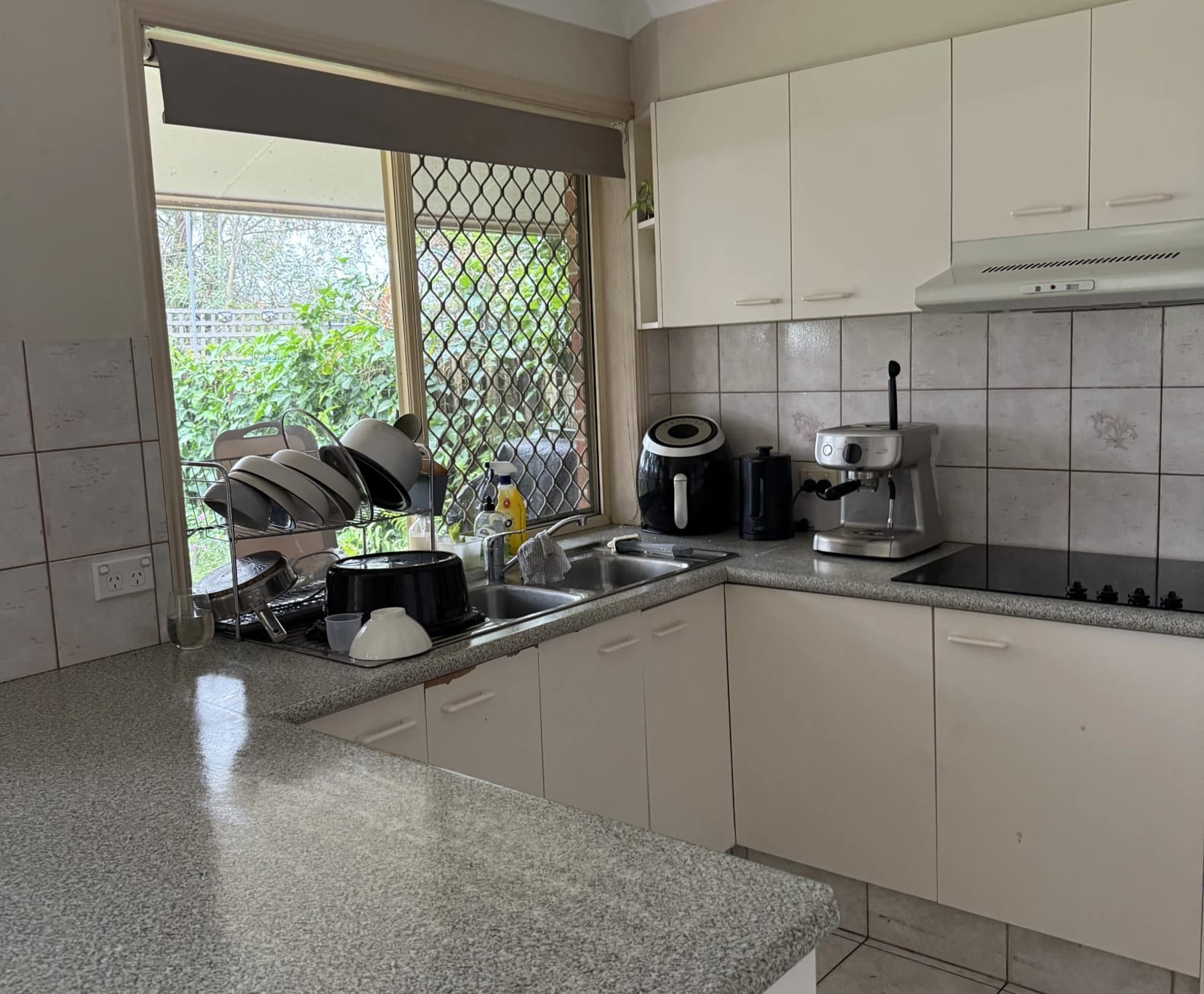 This townhouse is in the perfect location! 8 mins drive from Burleigh and the beach, bottlo across the road and cheap as chips! Very spacious, heaps of room to have your own space and invite friends over. We have a backyard with a seating area, garden patch and lots of sun! 2 bathrooms, laundry, open living area/lounge and a full size kitchen. Your room is roughly 3x3 meters with a built in wardrobe.