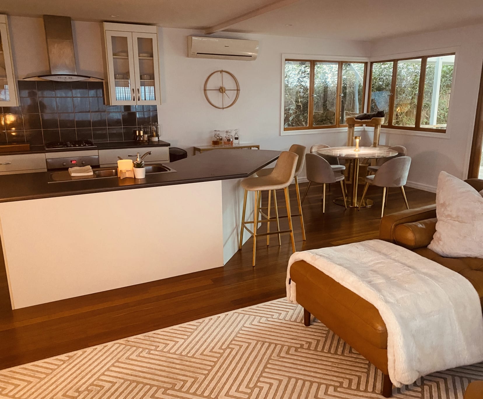 There is a large open plan living/dining/kitchen space opening up onto a huge deck, perfect for relaxing in the summer breeze. It’s got a great vibe. Big 4 burner Webber BBQ and plenty of room for entertaining.