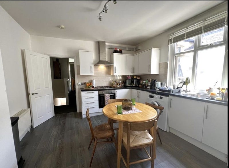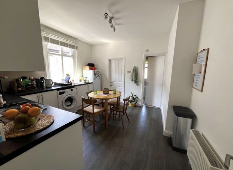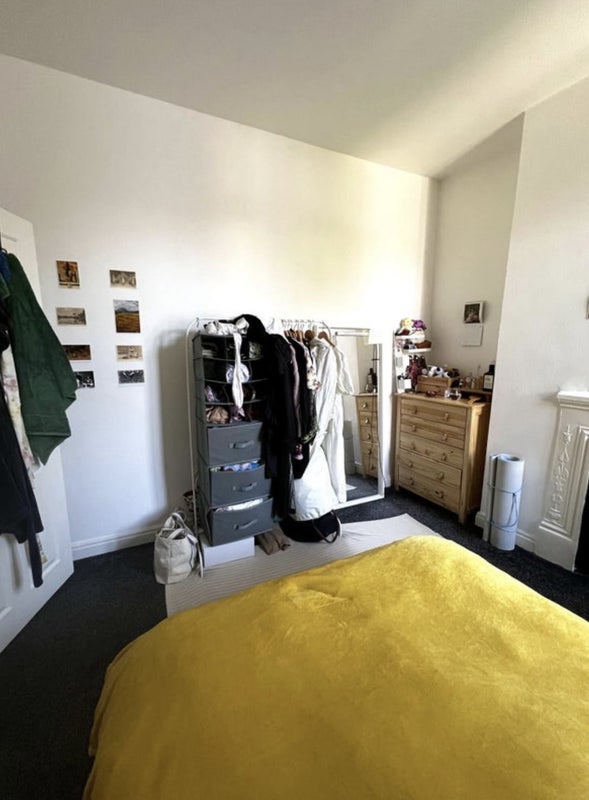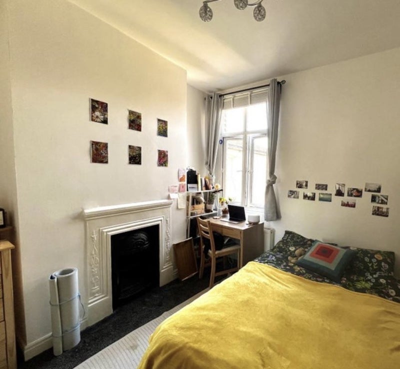 The available room is a spacious double room with enough space for a double bed, shelving, a small desk, and a chest of drawers. The room comes partly furnished, and there is an option to discuss purchasing additional furniture from the current housemate. The flat features a cozy sitting room with a sofa, a shared kitchen, and a bathroom. Street parking is available, and the neighborhood boasts local convenience shops and friendly neighbors.