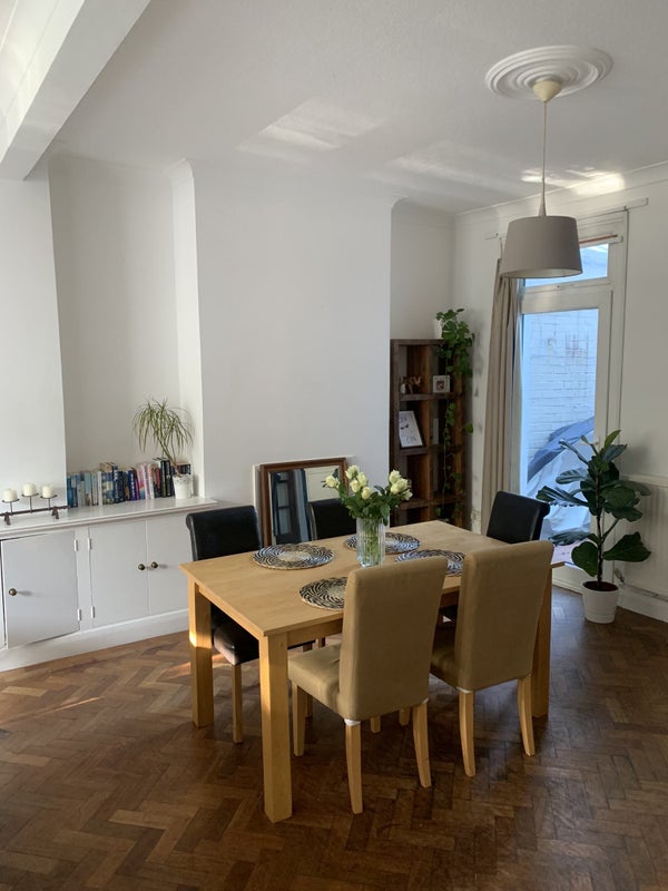 Located in Wandsworth, this spacious house has a double room available for rent at the beginning of November. The room comes fully furnished with a double bed, ample storage space, a chest of drawers, and a desk. The house features an open plan living/dining area and a charming garden patio. Situated on a quiet family street, the property is equidistant from East Putney tube and Wandsworth Town station, both a 10-minute walk away. Southside shopping centre, along with various pubs and restaurants, is conveniently located within a 5-minute walk. Currently, the house is shared by three young professionals - Kate, Bex, and Brooke, who are seeking a fun, clean, and considerate housemate to join them in their lovely home.