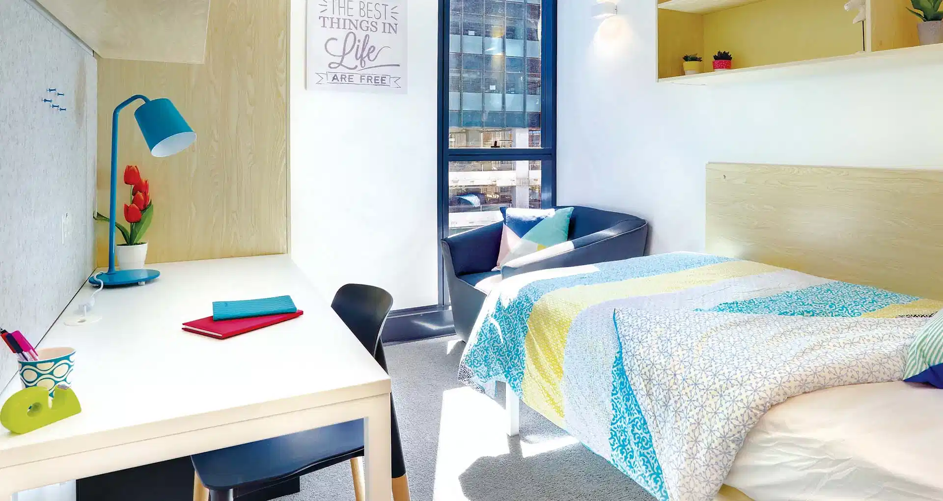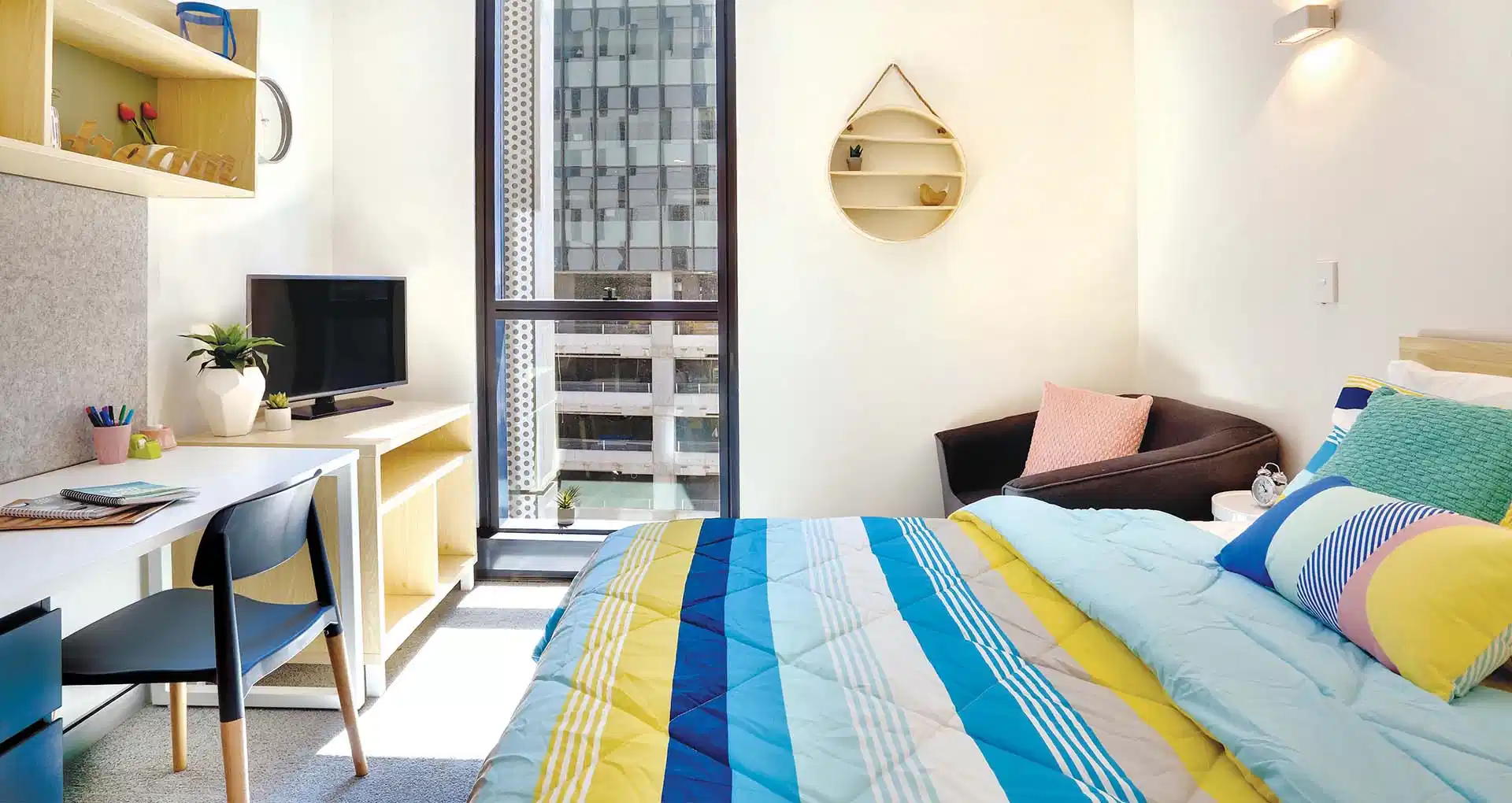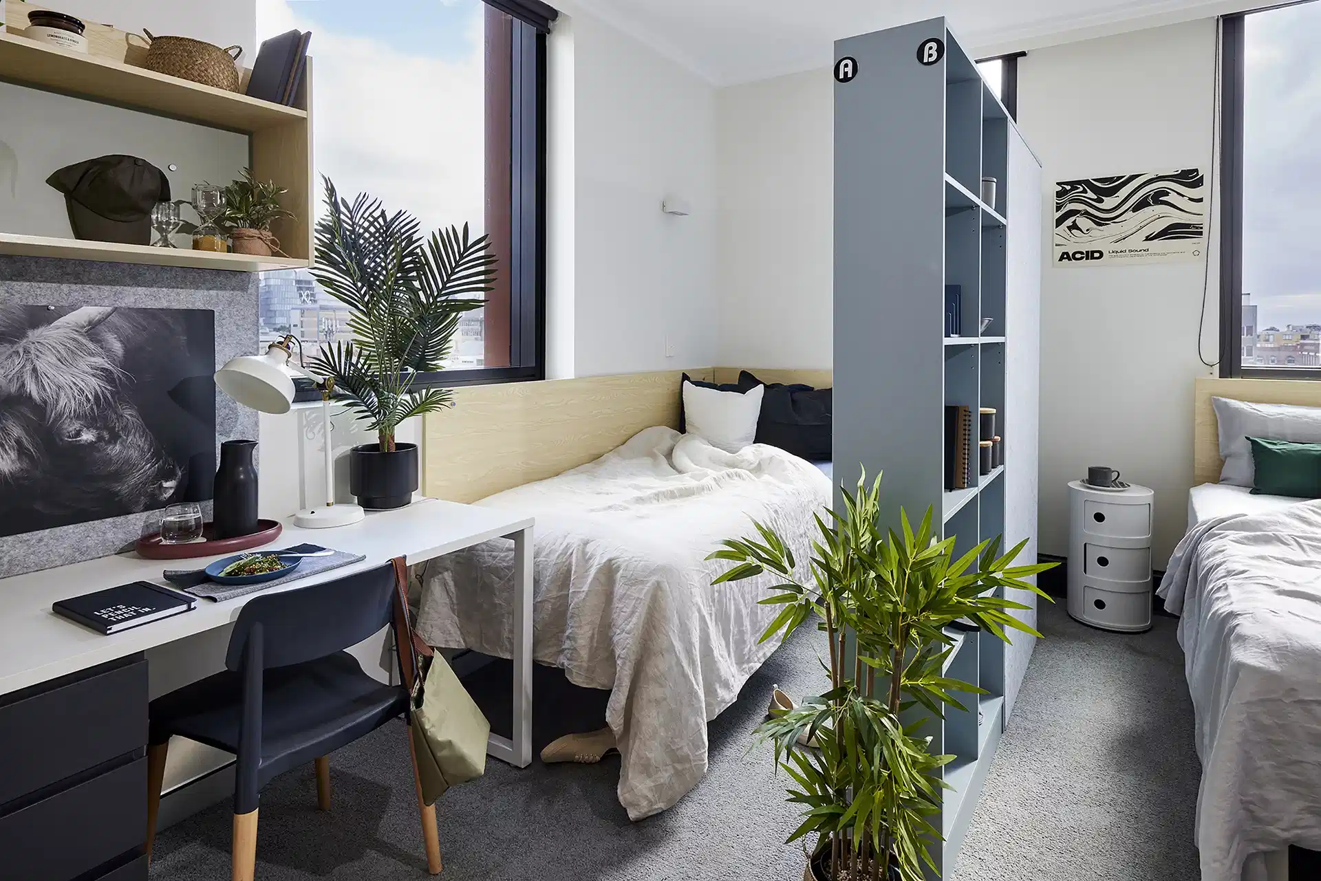 It is best student accommodation in Australia for sharing with friends or to meet new people features a bookshelf divider that separates the two beds, air conditioning, a modern-equipped kitchen and a private ensuite bathroom.