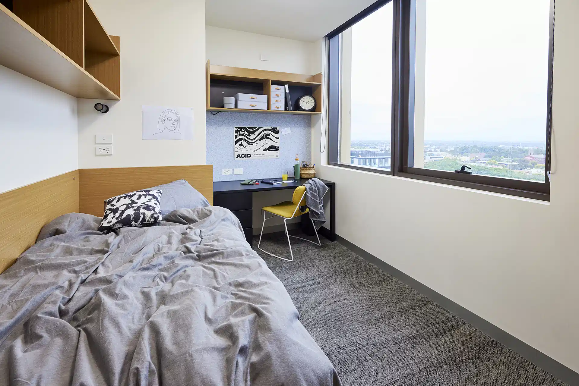Twin Shared Apartment - Twin shared rooms are fully furnished rooms in the 5 or 6-bed apartments, ideal for sharing with friends or siblings. Each room has its own private ensuite bathroom, air conditioning, and storage. This is a budget-friendly housing option in Melbourne, costing A$379 per week.