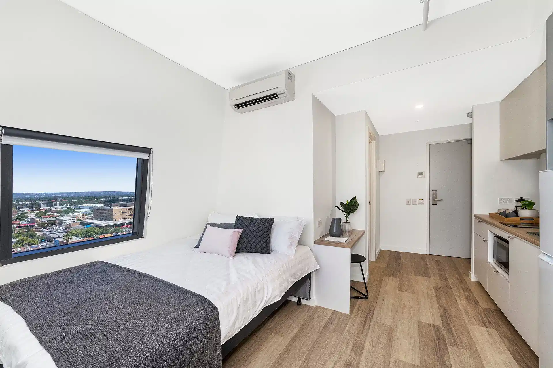 Students looking for luxurious accommodation in Adelaide can choose to stay in a studio apartment at Scape Waymouth. These single occupancy rooms feature AC, LCD TV, study desk, a kitchenette with modern appliances and a private bathroom. The starting rent for the studio is around $469 (INR 41,602) per week. Further, the studio apartments are classified into the following categories.