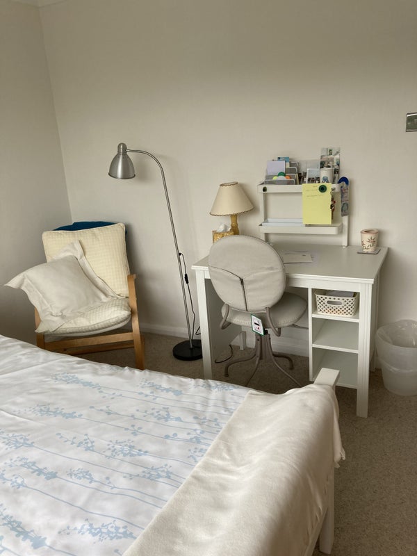 The available bedroom in this home is thoughtfully furnished with all necessary amenities for a comfortable stay. The room includes bedding, towels, and even a robe and slippers if required. With a large window allowing plenty of natural light, residents can enjoy a cozy and welcoming atmosphere. The shared spaces in the flat are well-maintained and provide a peaceful environment for relaxation and study. Practicality and comfort are prioritized to ensure a pleasant living experience for all occupants.