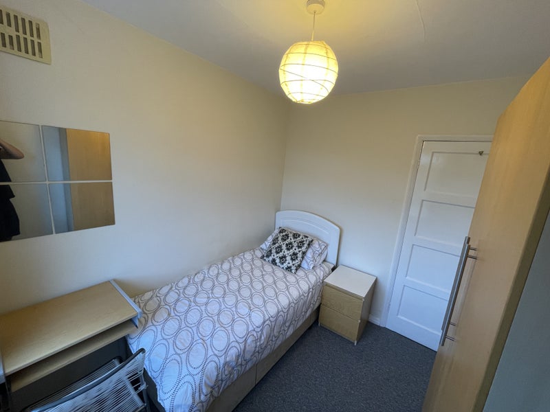 The first floor bedroom available for rent is ideal for professionals or mature, postgraduate students. While not large, the room is immaculately maintained and comes fully furnished with a single bed, large wardrobe, chest of drawers, bedside cabinet, and mains TV aerial point. The shared living spaces include a large living room with a pebble effect electric fire, modern fireplace, leather furniture, and a TV. The spacious breakfasting kitchen is equipped with a table and chairs, breakfast bar, and patio doors leading to a secluded back garden and paved area. The property also features a front garden, driveway, and garage with a remote control door. The house offers a quiet and comfortable living environment, shared with three responsible housemates.