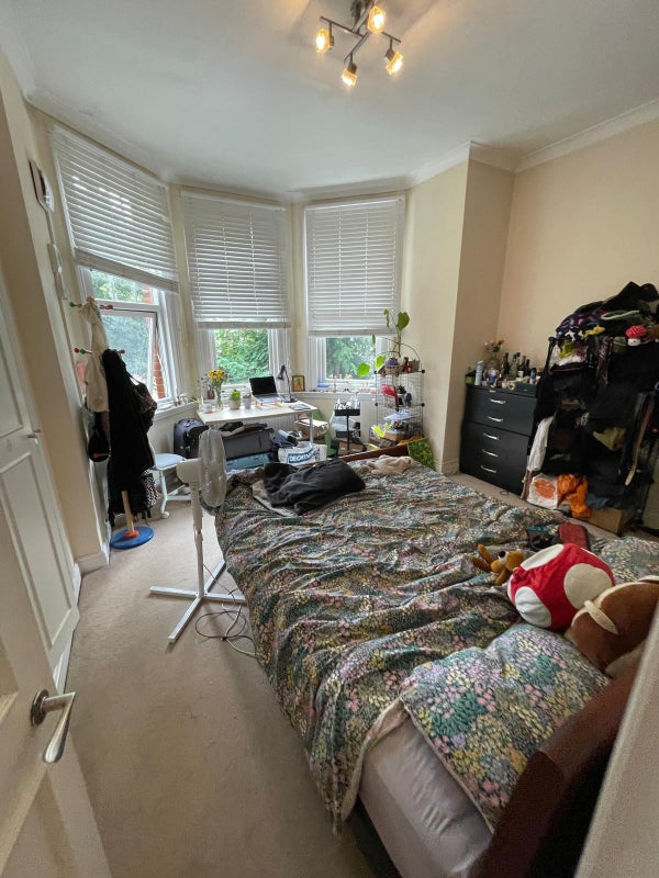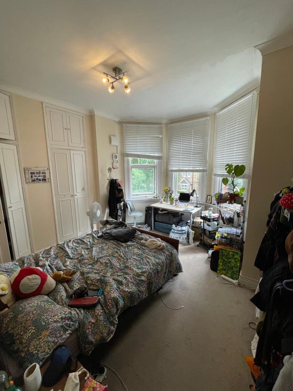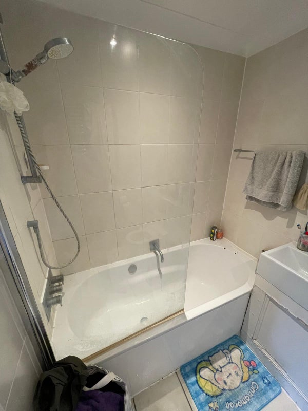 The available room in this Ealing home is a large en suite with a bathtub, toilet, and plenty of storage space. The furnishings are comfortable and practical, ensuring a cozy living environment. The shared spaces in the flat are well-maintained and offer a welcoming atmosphere for all residents. The overall feel of the space is inviting and conducive to relaxation after a long day.