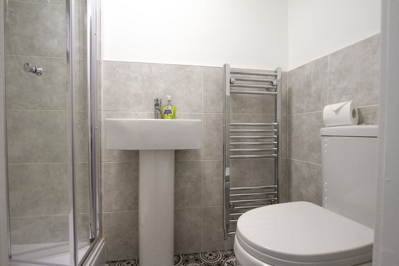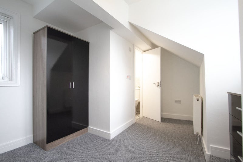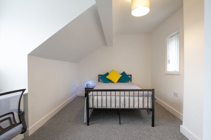 Room 5 in this houseshare offers a cozy and private living space on the top floor, providing residents with a comfortable retreat. The room is tastefully furnished with a double bed, wardrobe, desk, and in wardrobe drawers, ensuring ample storage and study space. The ensuite bathroom adds convenience and privacy for the resident. The communal kitchen/living area is well-equipped and designed for socializing and relaxation. The overall atmosphere of the flat is welcoming and conducive to both studying and unwinding after a busy day.